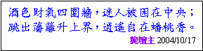 「三心四相」,進入忘我,是破除我執、破除斤斤計較的最好利器,也就是第七識轉識成智的最好方法。 有人以鹽來比喻這種忘我的精神。鹽投入水之中,就溶解在水中,沒有了自己,鹽跟水再也無法分別出來。每一滴水,都有鹽在其中;只要有水,也就有鹽在其中。我們願意修煉自己的心性,便千萬不要學做石頭,投在水中,霸佔一個位置,但永遠和水不能融合,這樣有自己(我執),即使怎樣修,都難以「真」啊。 |