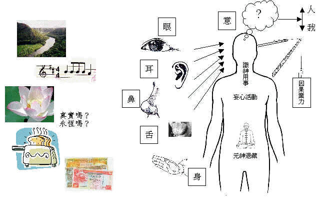 人生活在現實世界,如果不能正確對待周圍的人、事、物,以錯誤的見解和認知方法,就會障閉靈明,生起各種迷執,不斷為物所牽。故此正確的心識活動,有正見、正思、正念,是修行人避免無窮無盡又雜亂放逸的妄念,此起彼落的重要功課。 前六識的轉識成智 |