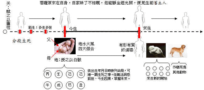 凡人所看到的是一期的生命,而看不到分段的生命。人的一期生命起始於父母陰陽交合之際,自己的遊魂投入母胎,藉父母的精氣而有此身,此即易經中所謂「精氣為物」,亦為生命誕生之時。人的生命終結於身體的衰老,當陰陽分離、四大分散,於是魂失其所,此即為死的時候。術家以人生年月日時干支,按陰陽五行推算命運,可得概略。 人死之後,魂便失去居所,重為遊魂,待再遇陰陽交合,感氣分而相投,於是又為另一生開始,此即易經中「遊魂為變」之義。遊魂為變是死生之際的一大轉變,有生必會死,但死後又生,故對這方面的研究不稱「生死」,而稱「死生」。但注意這轉變後的新生命不一定是「人生」,要看這個人在生前有什麼「居心」(指為人做事所立的心,如貪心、殺戮、邪淫等等,便非良善居心),作下什麼因果而定:居心在人可以仍舊為人,居心在鬼神、在其它動物,則為鬼神或其他動物,有四生六道之別。凡人不知道死後魂不滅,更不知人與其他動物生死互變,所以認識「死生之說」極具意義。 研究死生之說,必須了解生死來源。昔日子路問死,孔子答道:「未知生,焉知死。」意思說,知死必須知生。生死相續,如果尚未知生,何能真正知死,欲能知生知死,唯須原始反終。《易‧繫辭上》:「原始反終,故知死生之說。」此是說考察萬物之始,而知其所以生;究求萬物之終,而知其所以死。原始,可知遊魂趣入陰陽交合之境,始有生命;反終,由生命之始,而知生命之終。 一期生命可由命理推算,但對死後之生便無能為力,因其涉及前世心識、因果業報、十二因緣等各種關係。了解死生、遊魂之義,就能夠正視多生以來的生死大問題,原來人的生前死後及現世,實有「真靈真性,始終不生不滅,不垢不淨,不增不減。靈性所在,力能托鼎;六道輪迴,法輪常轉,在天道、神道、人道、地獄道、餓鬼道、畜牲道六道之間,升降浮沉,這種循環在暗裡暗則不見,善德自光明要走上光明道必須積善立德」(09年3月29日龔壇主乩文)。凡人看不到生命的暗裡循環,每一期生命其實猶如一個載體(如車船飛機),供心身內真靈真性這一位乘客乘坐,這位真主人,別人看不到,自己竟也不自知。他在生命的每一分段更換載體,終而復始,死後又生,猶如河水長流,永遠不斷,坐完這班車,又搭下班船,一世一世的除皮脫殼,改頭換臉。所以不說「生死」,而說「死生」,還因為其中含有生死不斷之義。 為什麼會生死不斷?因為有遊魂趣境的問題,遊魂為何投入此境,這便是以前多生貪瞋痴愛的習氣驅使,使他遇境便不由自主,趣入氣分相投之境。解決之道,唯在生前修行,轉變心理,去其貪瞋痴愛之心,行深般若波羅蜜多,而照見五蘊皆空,五蘊空後則能度一切苦厄,一切苦厄度盡,然後能見諸法之清淨真相,所謂「早當修悟證真如」,找到「不生不滅,不垢不淨,不增不減」的真靈真性,進入究竟湼槃,永脫輪迴。 |