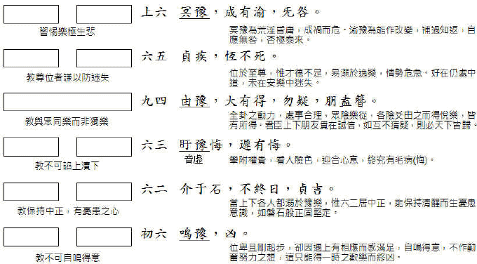 請看易經豫卦主要文字: 卦辭:豫。利建侯 (建立組織,利於治理) 行師 (懲治奸惡,消除禍害)。 彖曰: 豫,剛應而志行,順以動,豫 (九四之剛動得坤之順,致人心之和樂,豫之意也)。豫順以動,故天地如之 (動而合理,天地亦不違而依從它),而況 (何況) 建侯行師乎。天地以順動,故日月不過,而四 象曰:雷出地奮,豫 (陽氣雷動,生機勃勃,萬物振奮的現象為豫)。先王以作樂崇德,殷薦之上帝,以配祖考 (聖人觀象之後,仿雷制聲為鐘鼓,隆重祭獻,以表達萬民崇敬報答上帝之心,感謝其生生之大德。而在表達崇敬之時,亦同時追念列祖列宗所開創的功業,故作樂又有報答父母祖考的用意)。 上下和諧才是悅樂之道: 《易‧豫卦》第十六,坤下 豫卦的精神,以上為震,震為動,下為坤,坤為順,帶出一個「上有所動,下則順服」的狀態,彰顯出一個氣機通暢、生機蓬勃的境界,這才是真正豫樂的時候。豫卦的彖辭曰:「剛應而志行,順以動,豫」,這就說明了起主導作用的陽剛之氣得到陰柔之氣相應,樂於相從,上卦的號令行如流水,沒有滯塞,上下都感到無比的暢快和悅樂,這就是順以動,也就是豫的景象。人的身心上下氣機通暢,便感到暢快;社會當中,上下通達,便民情舒暢,社會祥和。 既然豫的精神,是上位者的舉動,順乎下面的民心,那麼具體而言,便必須知道民心之所向所趨,民之好惡,才能真正符合民眾的意願。豫卦卦辭曰:「豫,利建侯行師」,指出的正是在這「豫」樂的時候,最適宜、最有利作的事情。 豫樂乃因謙虛而達致: 豫的上下和諧,其實乃靠謙虛達成。各位留意今年 李道明師尊流年乩文,可看到通篇貫穿了謙的精神,告誡我們「自高自大滿招損,地中有山謙受益」,要「上交不諂下不瀆 諂為諂媚,即逢迎拍馬;瀆音讀或俗,為褻瀆侮辱,輕慢不恭敬意。原句出自漢 另外在易經六十四卦排列次序,豫卦為第十六卦,而前一卦第十五卦則為「地山謙 謙虛是一種美德,其難得之處,是願意不願意接受別人比自己更高、更強,更有條件和能力,做得比自己好。他位置在上,卻願卑下於人;明明富足,卻願虛以待人;明明有實力,卻不以其實力壓人;明明堅剛,卻示人以柔弱;明明有成績,而卻不搶功、不居功、不邀功;不誇己之能,不逞己之長,而反示己之不足。這種態度,若非真心誠意,出自內心,自覺真實的不足,恐怕難以維持。謙卦以山之高,竟委屈而藏於地,包容納蓄別人,欣賞別人,學習別人,其精神之偉大,是需要有「卑以自牧」、「虛而有容」的謙遜精神,方可以做得到的。 謙的實行,固然是有一種欲要長守「大有」的決心,而同時亦顯示守謙的君子,真正看到「一山還有一山高,強中自有強中手」的事實存在,知道個人始終有所不足,故而時時刻刻惕厲自己,不驕不躁,不威不霸,功而不伐(居功),成而不居。 簡述爻辭並窺其中戒逸樂亡身之意: 豫卦所談雖然是悅樂暢快,言人之心情振奮,通暢順達的問題,這固然可以使人事的發展容易增進和成功。但在卦中各爻,卻不斷透露出戒懼的意味。因為歡樂興奮,一旦變得過度,就會恣情;情緒的悅樂,倘若沉迷,又會逸樂。恣情逸樂,沉溺於歡樂,就會敗事。因為歡樂的正道,是順其自然,而與物同樂,適可而止。自鳴得意,在歡樂中迷失,樂極生悲,都是可以將以往的成功、物質生活上的豐裕、精神品德的謙厚,使之在其中發生改變。故此豫卦諄諄告誡人們,和樂容易沉溺,而發生悲慘的結局。居安思危,居樂思憂,應該是豫卦學習後所得到的珍貴教訓。 |
