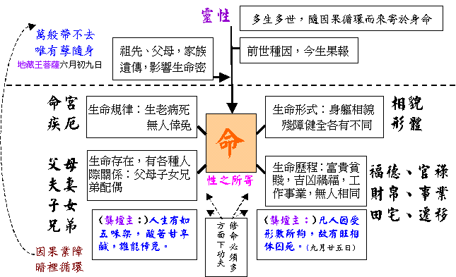 如果我們再對照神仙降壇經常發出的訓誨,就能更清楚了。如 龔壇主今年九月十九日專門針對患有重病的人們,「痛不欲生、苦不堪言、痛苦折磨、病魔摧殘、叫天不應、叫地不聞、百病纏身、藥石無靈」的狀況,指出「心病還須心藥醫,誠心懺悔,懺其過去惡孽,悔改反省,徹徹底底」, 卜應天祖師:「遷惡從善,棄暗投明,懺其過去惡業,悔不當初。前世唔修今世修,凡間重修,重新做人。」(21/3/04)可惜,人們不明白懺悔改過的重要性,能循此方向去努力修德(修真、修身)的不多,令 龔壇主也發出慨嘆:「撫心自問,日夜行持,全力以赴,落落無幾」(31/10/04)。 什麼是「命」? 人在痛苦災厄之中,常常覺得一切皆是命定,沒法改變, 由上圖可以看到,人生的「命」定,是他過去世的所作所為,不斷循環加減,積累而成。在這一角度說,前世因,今生果,他的「命」已由他過去的所作所為「定」下了。如果他今生有痛苦疾厄,定是前世罪孽惡孽所積(過去世的因果,今世又未能清償,甚至再累積)。這就是 地藏王菩薩今年降壇時所說「天網恢恢,疏而不漏。萬般帶不去,唯有孽隨身」的意思。 錯誤觀點:「萬般皆是命,半點不由人」 然而我們也要知道,我們的未來,其實可以由自己的努力改變,可以由我們把握, 龔壇主更指出所謂「萬般皆是命,半點不由人」的說法,屬「錯誤觀點,誤導眾生」(31/10/04); 司馬頭陀祖師說:「努力可以改變命運,千真萬確」,並勉勵說:「初修之士,形數所拘,生長壯老病死,十二循環……,上至帝王,平民百姓,誰可倖免。有幸有不幸,欲知富貴貧賤,吉凶禍福,先要知命認命,方能改命造命(亦即修命)。丹成我命由我不由天,逍遙自在得安然」(4/7/04)。 「修德」最重要,命不決定一切,「德」才決定一切。留意今年乩文特意強調「一德二命三風水,四積陰功五讀書。道德至上,德能全生。」(北斗星君17/10/04、濟佛19/9/04)說明這一重要原則。修德先要懺悔改過,「下定決心,排除萬難」,努力行善,積累功德。 龔壇主如此勉勵:「在道壇佛社仙佛之前,發願立願,立下決心(即決心改過)。心性至大這決心的力量無比巨大,一切唯心一切變化可以由心力改變。今生今世,今日心念,一念之間今日的一個善念可以影響今生今世。人有善願,天必輔之,千神輔祐。潛修密煉,潛移默化,積累陰功陰德,三千功勳,八百德行。言行舉止,言出必行,坐言起行。……簡而言之,知命認命,改命造命,盡人事,而安天命。苦心笑臉(極為關鍵),不久自昌。」 |