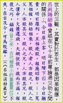 災禍,其實是因果規律中,惡業的果報。今年的災禍,是「干戈加瘟疫」(天后聖母三月十九日乩文),致使「黎民苦不堪」,避免災難的方法,只有「積善消孽障,災消福自臻」。