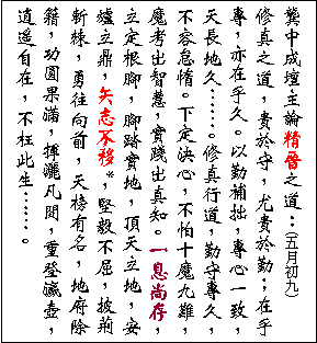 能除嗔恚(音位,惱怒、怨恨)忿懣(不服、怨憤)。眾生最容易發露的毛病,往往是在人際間缺乏度量,斤斤計較,怨恨忿怒,內心時生不滿,這也是修行的最大障礙,於人無益,於己有損,輕則令自己心意煩燥,重則肝目受傷,而且將以往的善業功德,一下抵銷。有些修行多年,在各方面都成為道門、社會、人群的模範榜樣的人,竟也會因為一些不合意、違逆自己想法的事情,生起忿怨之心,「黑起口面」,甚至火爆發脾氣,於是「一把無明火,燒盡功德林」,而致「千年道行一朝喪、一失足成千古恨」。我們每一位壇生、值事,都應該像如臨深淵,如履薄冰一樣,非常小心防範這種危險的事發生。 |