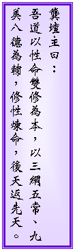 我們不獨靜坐時要修真,去妄心,存真心;而更重要的,其實是在平日一切時、一切處,在作任何行為中,亦需要修真,去妄心,存真心。否則不但談不上修真,就是本來從靜坐得到的一些成績,也會消耗淨盡。怎樣是平時的去妄心、存真心呢?在我們道人來說,就是要有至誠之心,願意立下決心,守戒(身戒/有相戒,例如:三皈五戒、《太上感應篇》提出之戒等),去慾念心、去分別心、去傲慢心、去煩惱心,而從積極的角度說,就要實行「三綱五常、九美八德」,並且積功立德。這就不但在靜坐時做到修真,更在平時活動中也做到修真,廿四小時,行住坐臥,都在修真之境。不去妄心,難存真心;不通過身戒,難達到心戒,因為前世今生的孽障、業力,時時刻刻都會阻礙我們,不希望我們了結。決意修真,就要準備比普通人吃更多的苦,渡過更艱難的考驗。 |