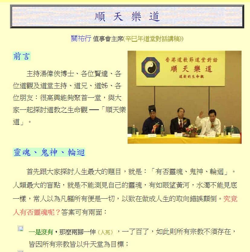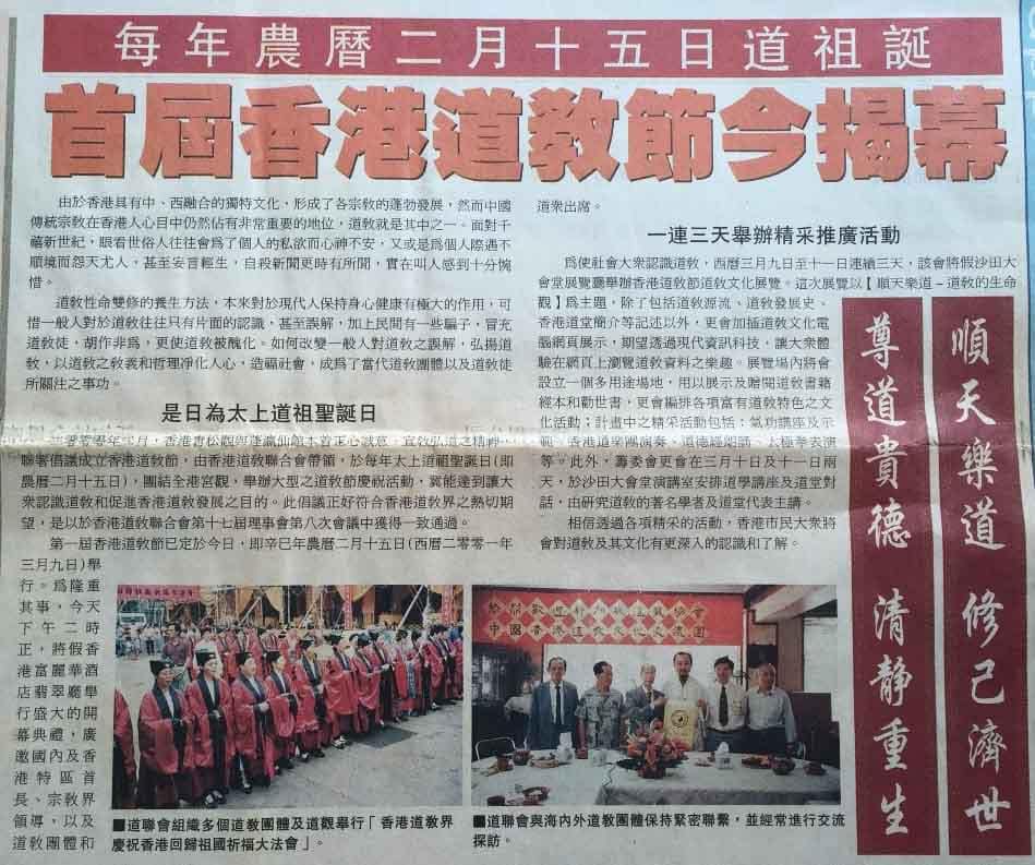 2001年3月9日(農曆二月十五日)道聯會舉辦首屆香港道教節。本觀參與展板講解及派送善書工作,前主席關祐行參與道堂對話─順天樂道(道教的生命觀)演講。