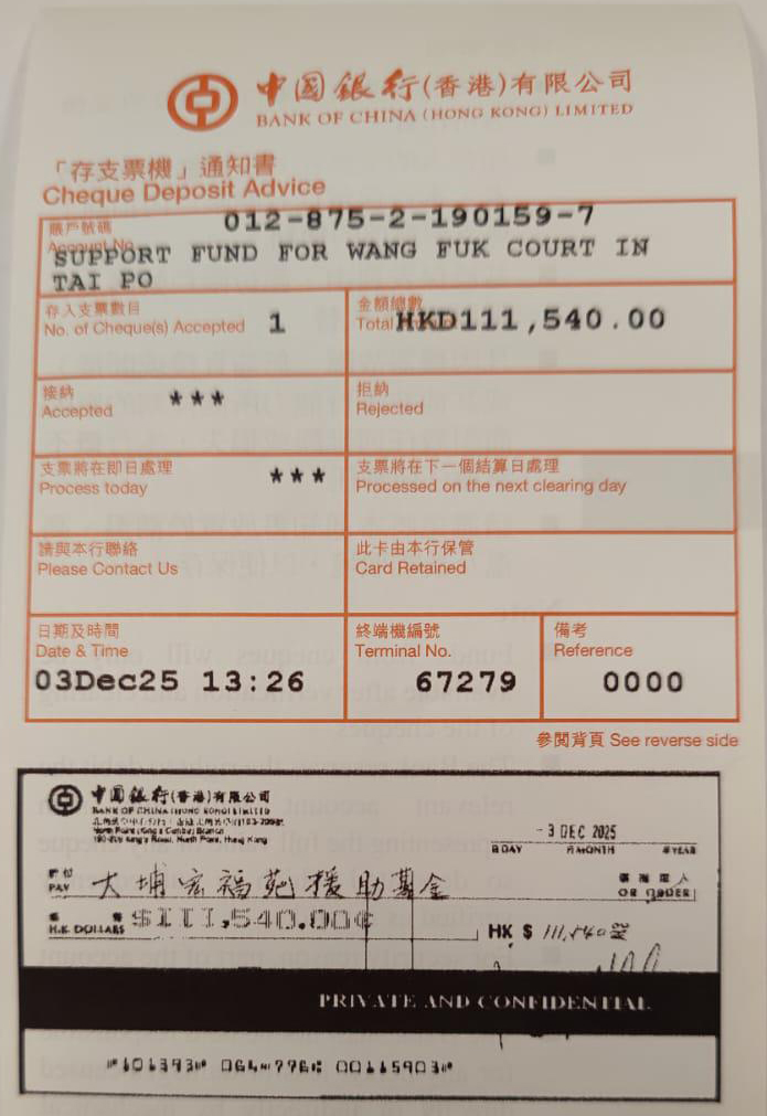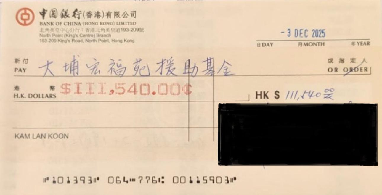 當日共收到賀儀及捐助總額 $111,540港元。為表達對大埔宏福苑災民的深切關懷,我觀已將慶典當天所收到的賀儀及捐款全數轉給「大埔宏福苑援助基金」,略表綿力。